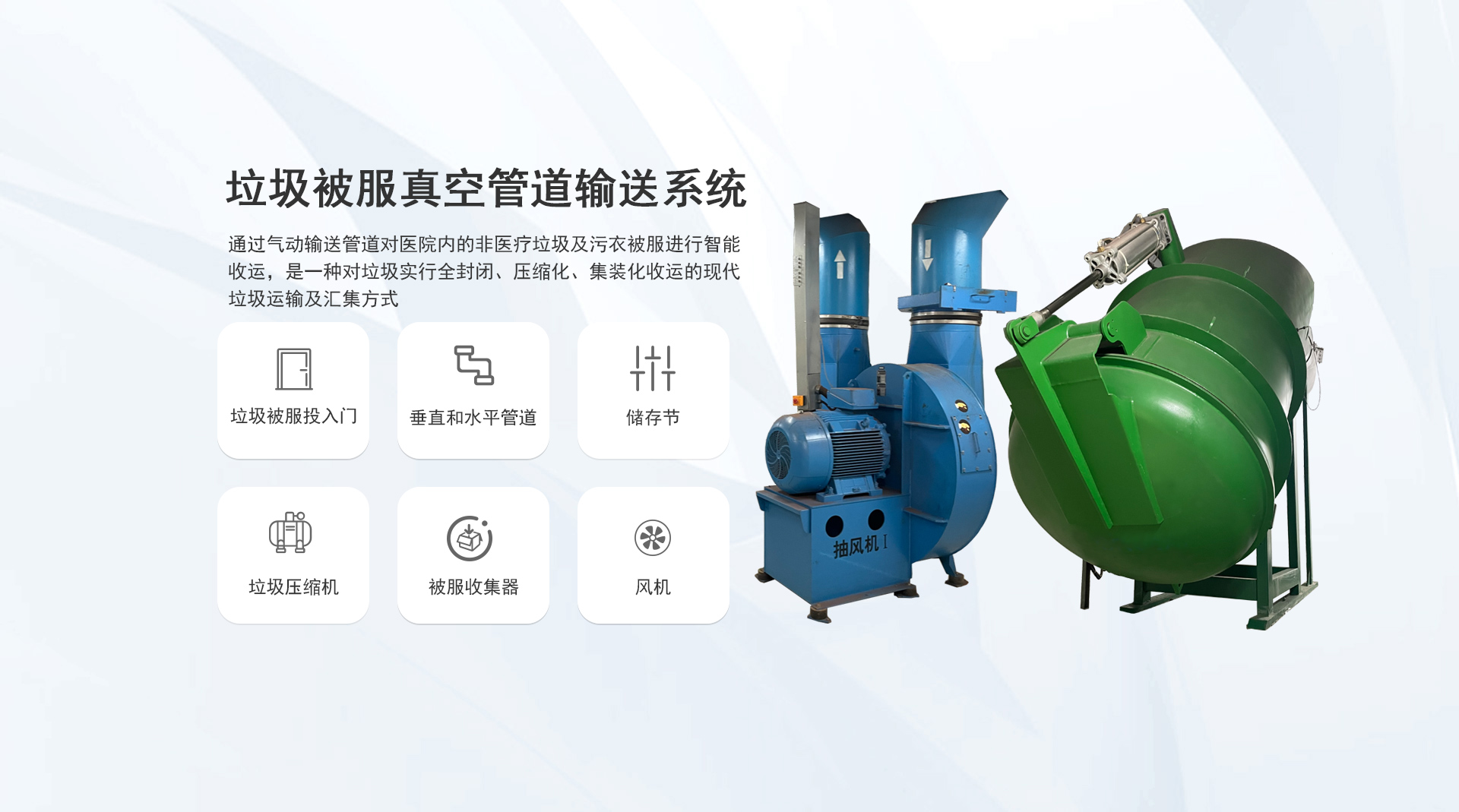 系統(tǒng)簡介:通過氣力式輸送管道對醫(yī)院內的垃圾和污衣被服進行收集,是一種對垃圾實行全封閉、壓縮化、集裝化收運的現(xiàn)代垃圾運輸及匯集方式...
